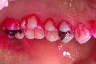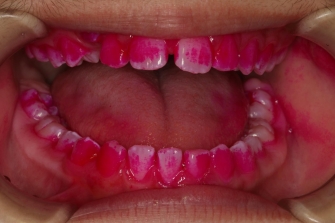歯が赤く染まっているのは磨き残しの歯垢(プラーク)です。磨いているつもりでもどうしても残ってしまう磨き残しをきれいにすることは、虫歯や歯周病の予防だけではなく、高齢者の方の場合は「誤嚥性肺炎」の予防にもつながります。