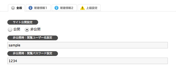 | サイト公開設定 | ホームページの公開状況を設定します。非公開の設定にした場合は、閲覧時にユーザー名とパスワードを入力画面が表示されます。 非公開時のユーザー名とパスワードは、 「非公開時:閲覧ユーザー名設定」 「非公開時:閲覧パスワード設定」 で設定して下さい。 |