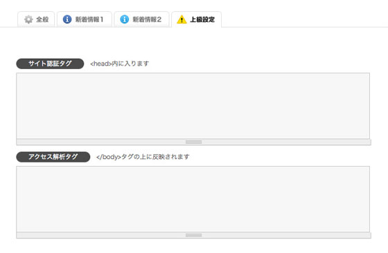 「サイト認証タグ」は、GoogleやYahooのmetaタグ認証をする場合に入力します。