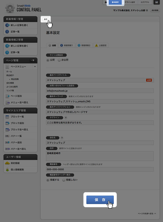 各項目を編集して「保存」ボタンをクリックすると、基本設定が更新されます。