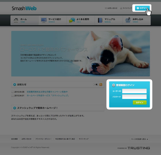 管理画面へのログインはスマッシュウェブのサイトから行なうことが出来ます。