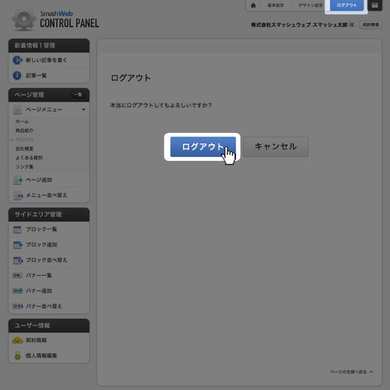上部メニューの「ログアウト」ボタンをクリックすると、確認画面が表示されるので、「ログアウト」ボタンをクリックします。