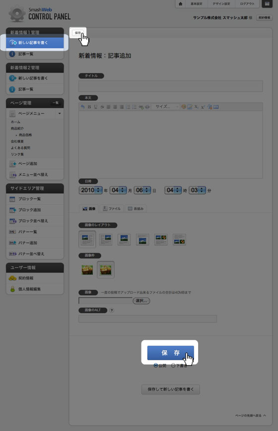 「タイトル」「本文」を入力して「保存」ボタンをクリックすると、新着情報が更新されます。
