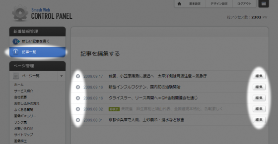 「新着情報管理」メニューの「記事一覧」をクリックすると登録済みの新着情報の一覧が表示されます。 この画面から、新着情報の編集と削除を行う事ができます。