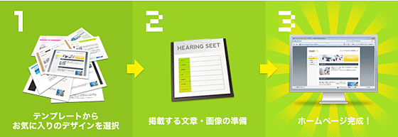 テキストと画像を入れていくだけで、プロのデザインしたホームページが完成します。